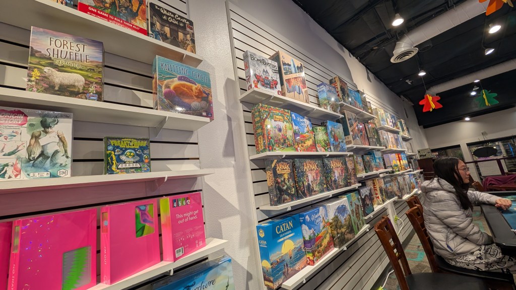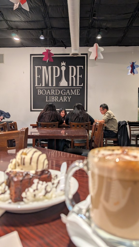 I rolled in, grabbed a cup of coffee and dessert, and just soaked in the scene. Tables were full. The crowd was lively but relaxed. You could feel that easy, welcoming “you can hang here” energy—the kind of vibe that makes you want to stay for one more game… and then another. Empire is built for that: it’s a game library + café, with an absolutely massive wall of choices and folks on staff who can help you pick something and get rolling.
